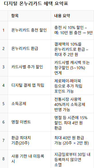| 온누리카드 결제 후 환급 | 주간 누적 결제액의 10% 환급 – 최대 2만 원/주 |