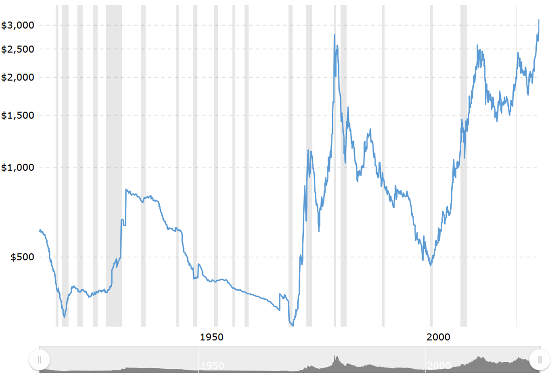 - 2018~현재(2025): 미중 무역갈등, 팬데믹, 인플레이션 → 사상 최고가 돌파 (1,200달러 → 2,942.70달러, 약 2.5배 상승)