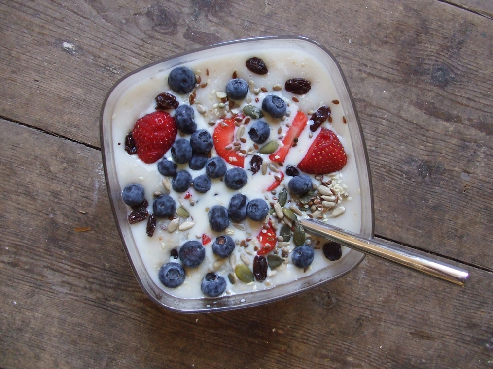 신선한 그릭요거트에 딸기, 블루베리, 바나나 등 다양한 과일을 곁들이면, 비타민과 식이섬유를 보충할 수 있어요.