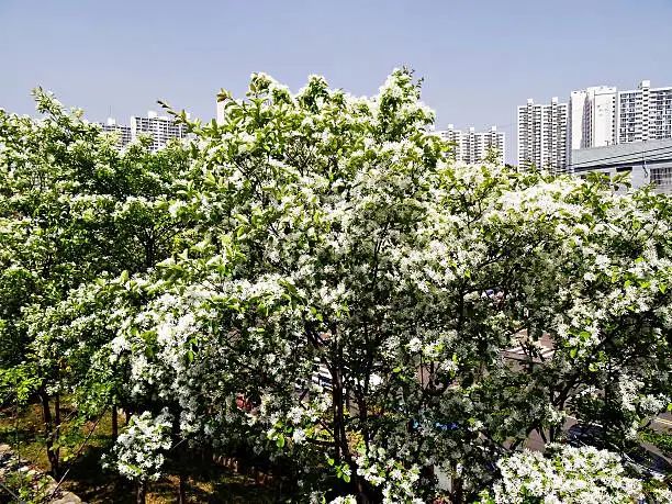 인천 송도 센트럴파크 현대적인 도시 풍경 속 대규모 이팝나무 군락지