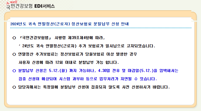 - 2024년도 귀속 근로자 연말정산 결과, 정산 보험료가 해당 월 보험료 이상으로 발생한 경우에만 분할납부 신청이 가능합니다.